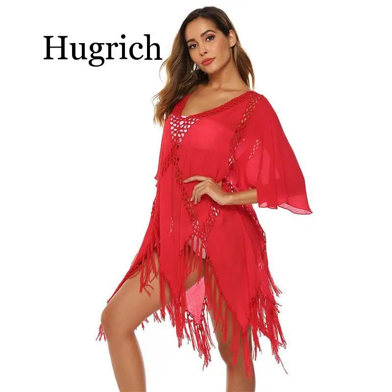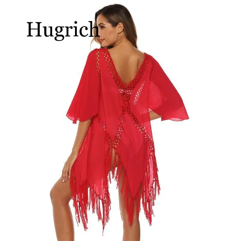 | Sexy Cover Up Swimwear Beach Dress Sheer Bathing Suit Cover Ups Robe De Plage Beach Wear Red Tassel Tunic Sleeve V Neck Cover-up |