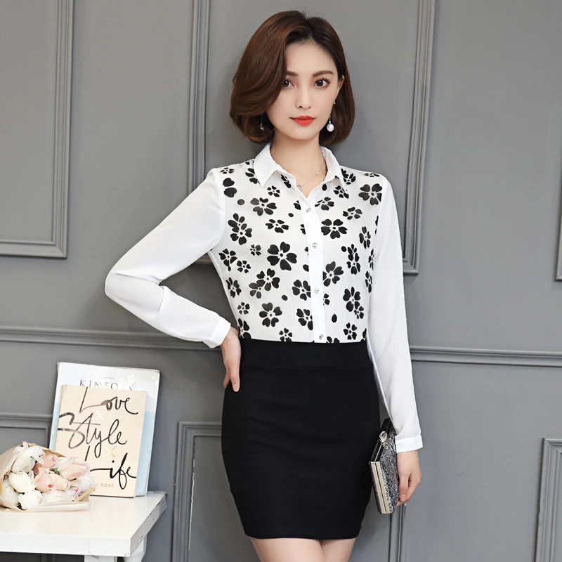 | Women Business Casual Shirts White Navy Blue Flower Pattern Chiffon Top Spring Autumn Woman Elegant Shirt Office Outfit 2020 New |