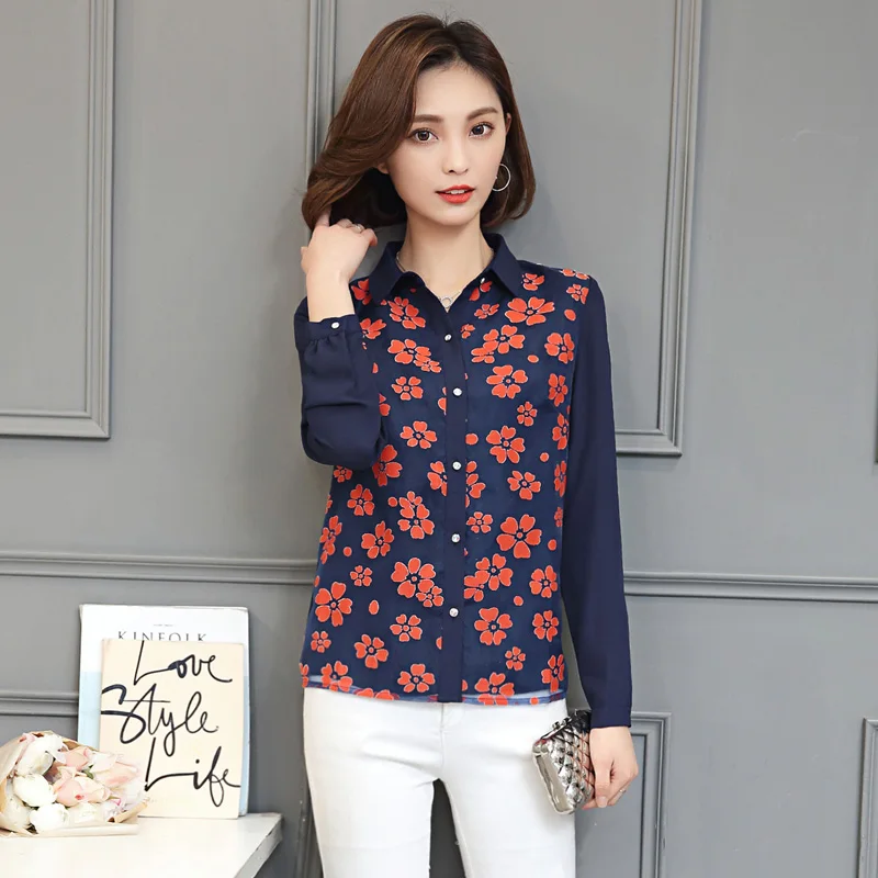 Best Price Comparison With Women Business Casual Shirts White Navy Blue Flower Pattern Chiffon Top Spring Autumn Woman Elegant Shirt Office Outfit 2020 New