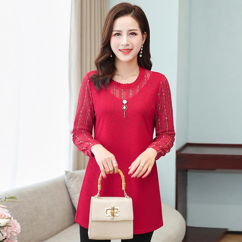 | Fashion Women Spring Blouse Sequined Lace Patchwork Red Black Chic Classy Top Middle Aged Woman Casual Clothes 2020 New Arrival |