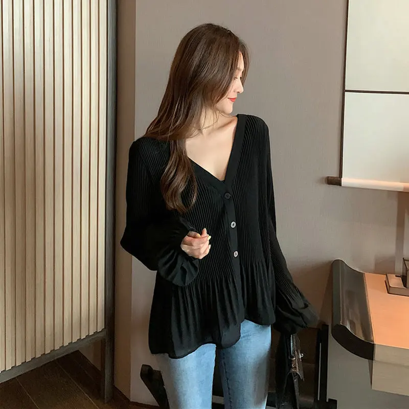 | Spring Summer Women Black Pleated Chiffon Shirts V-neck Long Balloon Sleeve Thin Drape Crepe Top Plus Size Girls Casual Shirt |
