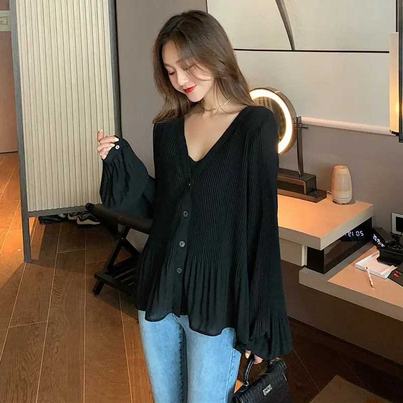 The best product you are looking for is "Spring Summer Women Black Pleated Chiffon Shirts V-neck Long Balloon Sleeve Thin Drape Crepe Top Plus Size Girls Casual Shirt". This product is available and ready to be purchased. Get attractive discounts every time you shop in our store (aliexpress.com). Aliexpress also provides a coupon of $ 3 for the first buyer to shop there. don't forget to bookmark our store page so you can go shopping again anytime..