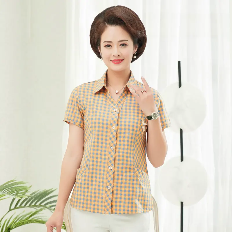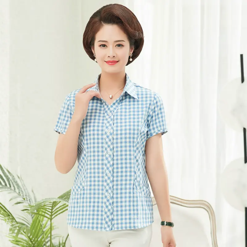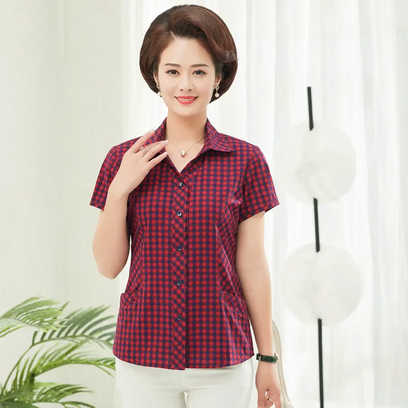| Spring Summer Women Short Sleeve Cotton Shirts Red Beige Blue Small Plaid Pattern Comfort Top Turn Down Collar Checked Clothes |