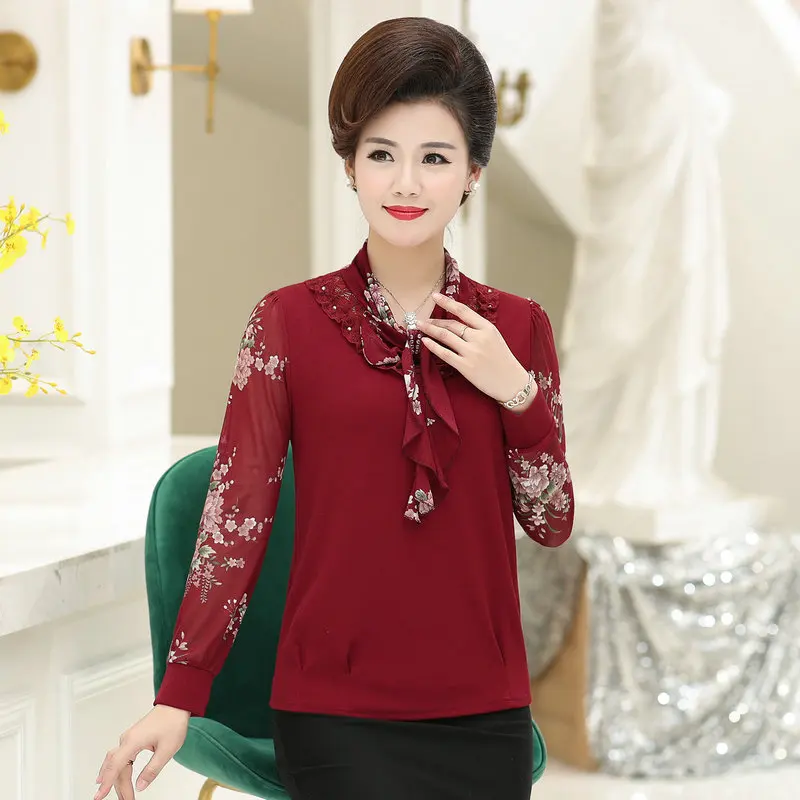 | Spring Woman Elegant Blouse Red Green Black Bowknot Collar Floral Chiffon Long Sleeve Tops Mature Women Chic Beaded Blouses 2020 |