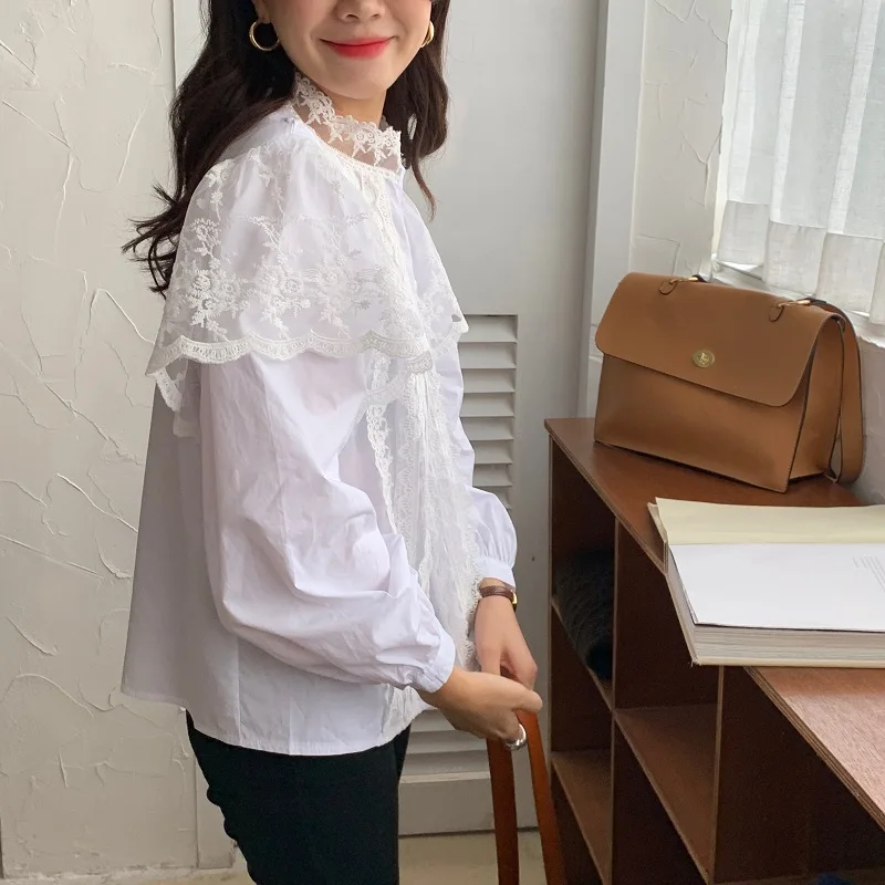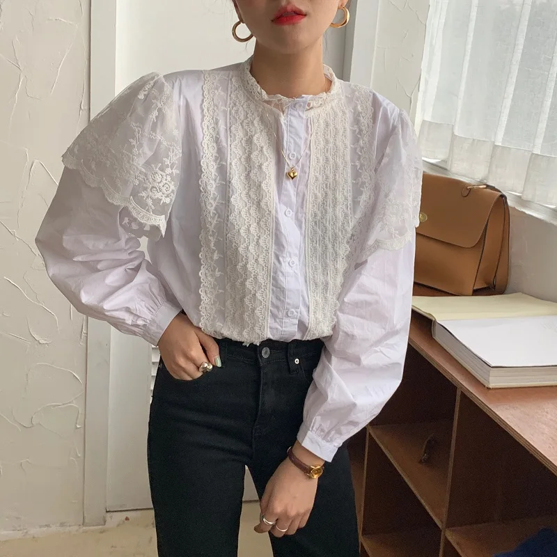 | Women Sweet Tops Lace Puff Sleeve Embroidery White Button Up Shirt Casual Long Sleeve Stand Collar Crochet Minimalist Blouse |