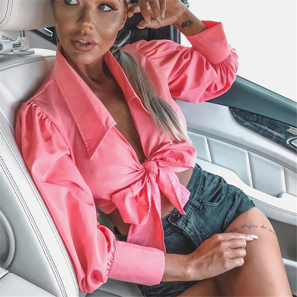 | Three Ratels 2020 Women Fashion Cotton Solid Blouse Tops Bow Strap Lantern Sleeve Cropped Shirt Casual Suitable Streetwear Shirt |