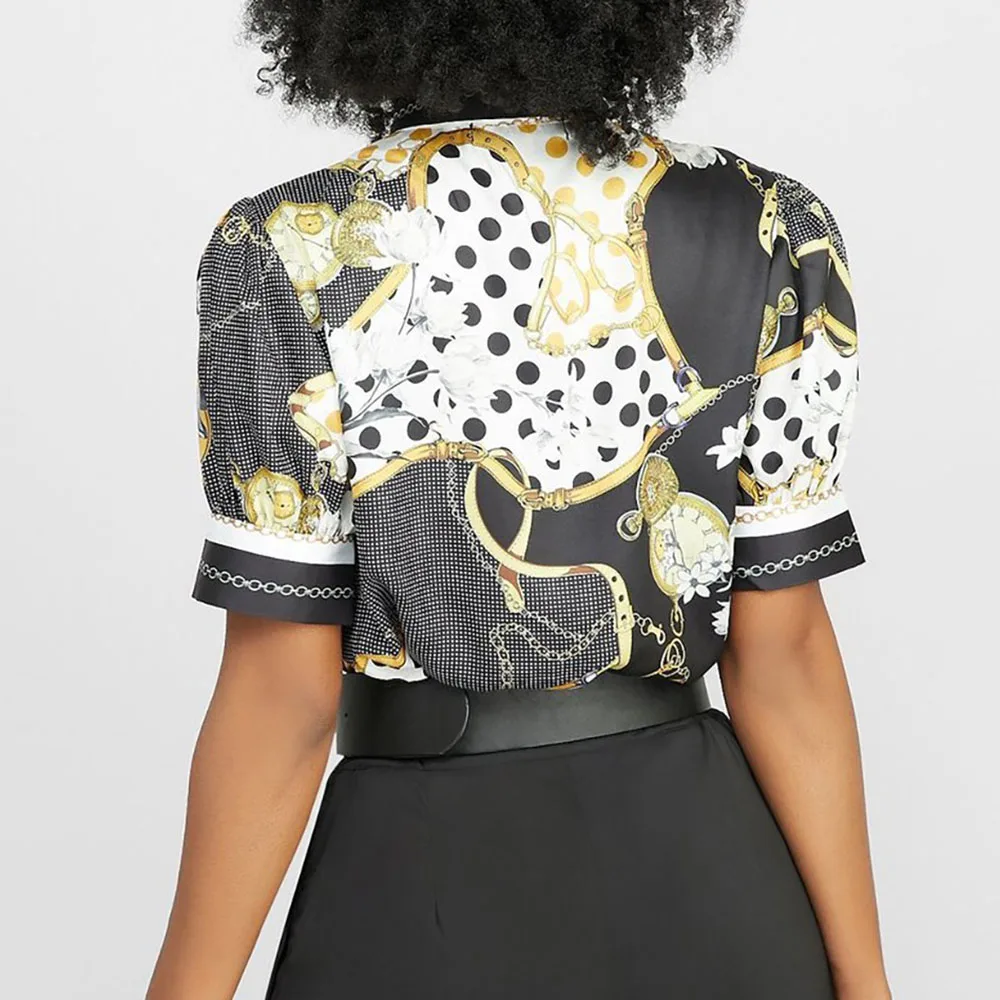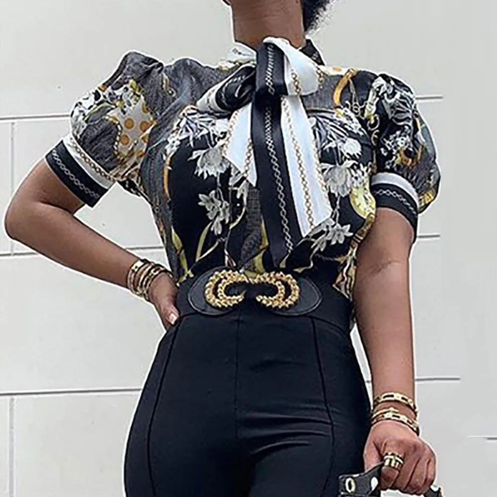 | Retro Elegant Black Floral Lantern Blouse Plus Size Women Vintage Office Ladies Turtleneck Bow Lace Up Summer Tops 2020 Shirts |