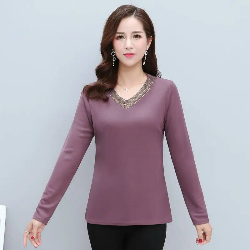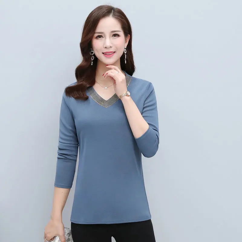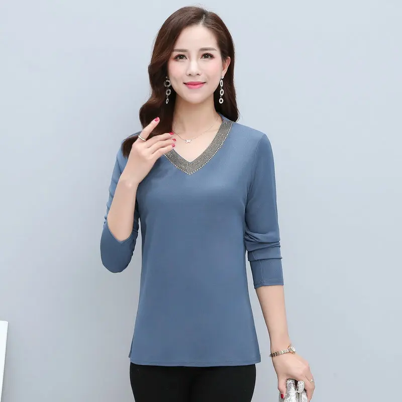 | Women Basic Blouses Sequined V-neck Collar Design Red Blue Purple Plain Colour Slim Fit Long Sleeve Top Woman Spring Clothes New |