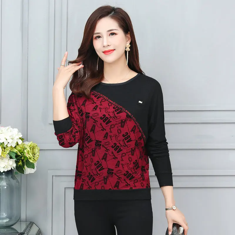 | Women Long Batwing Sleeve Blouses Red Khaki Letter Pattern Printing Patchwork Design Top Female Leisure Daily Clothes Plus Size |