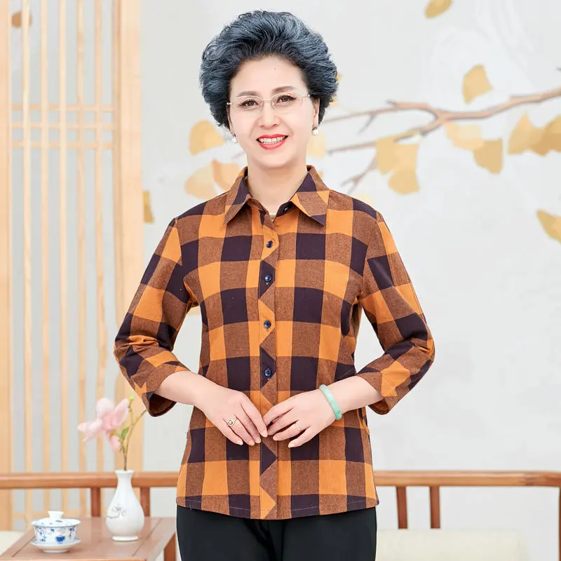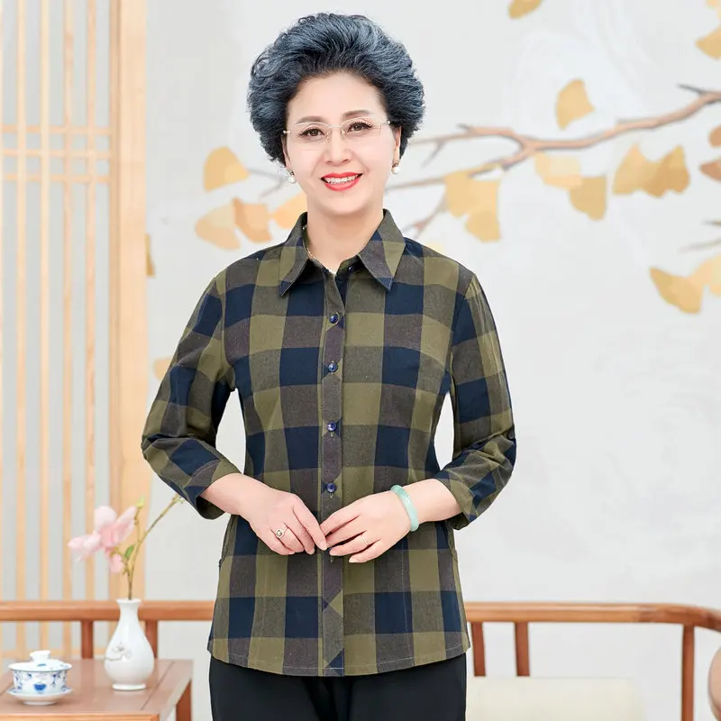 | Woman Casual Shirt Spring Red Yellow Green Plaid Three Quarter Sleeve Cotton Top Turn Down Collar Checked Daily Shirts Plus Size |