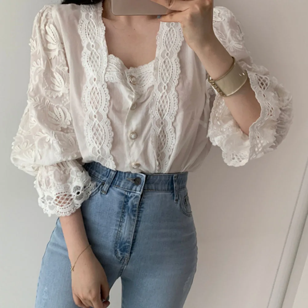 Women white shirts puff sleeve O-Neck embroidery lace Butterfly Floral Hollow out long sleeve Blouses office Spring Casual Tops