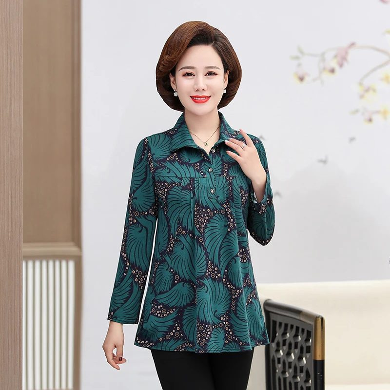 | Middle Aged Women Casual Shirts Red Green Orange Flower Printing Turn Down Collar Long Sleeve Spring Autumn Top Mature Woman New |