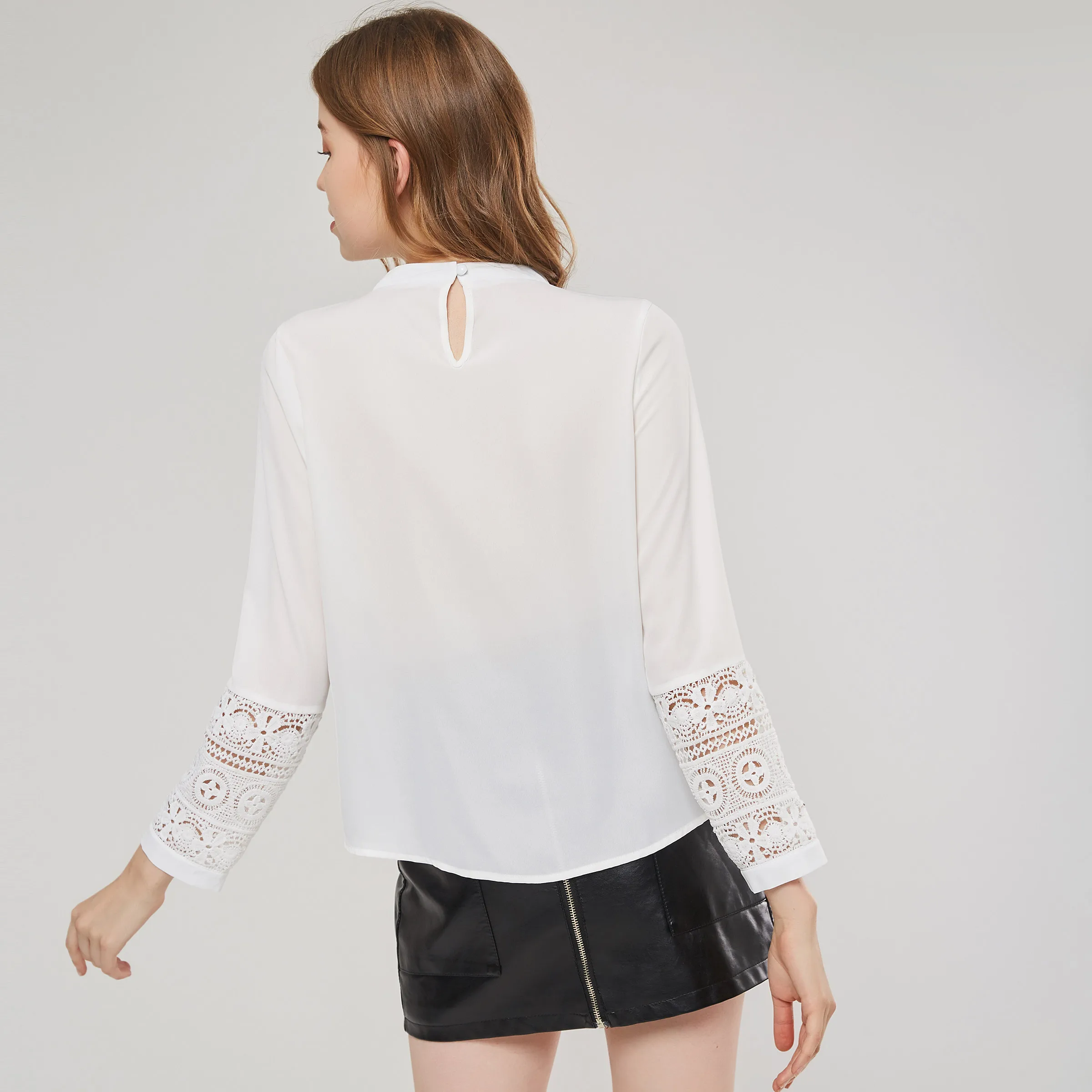 | Women Blouses Casual Simple Chiffon Stand Collar Pullover Casual Plain Gradient Pleated Patchwork Lace Button Female White Shirt |