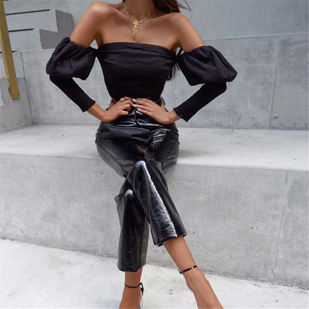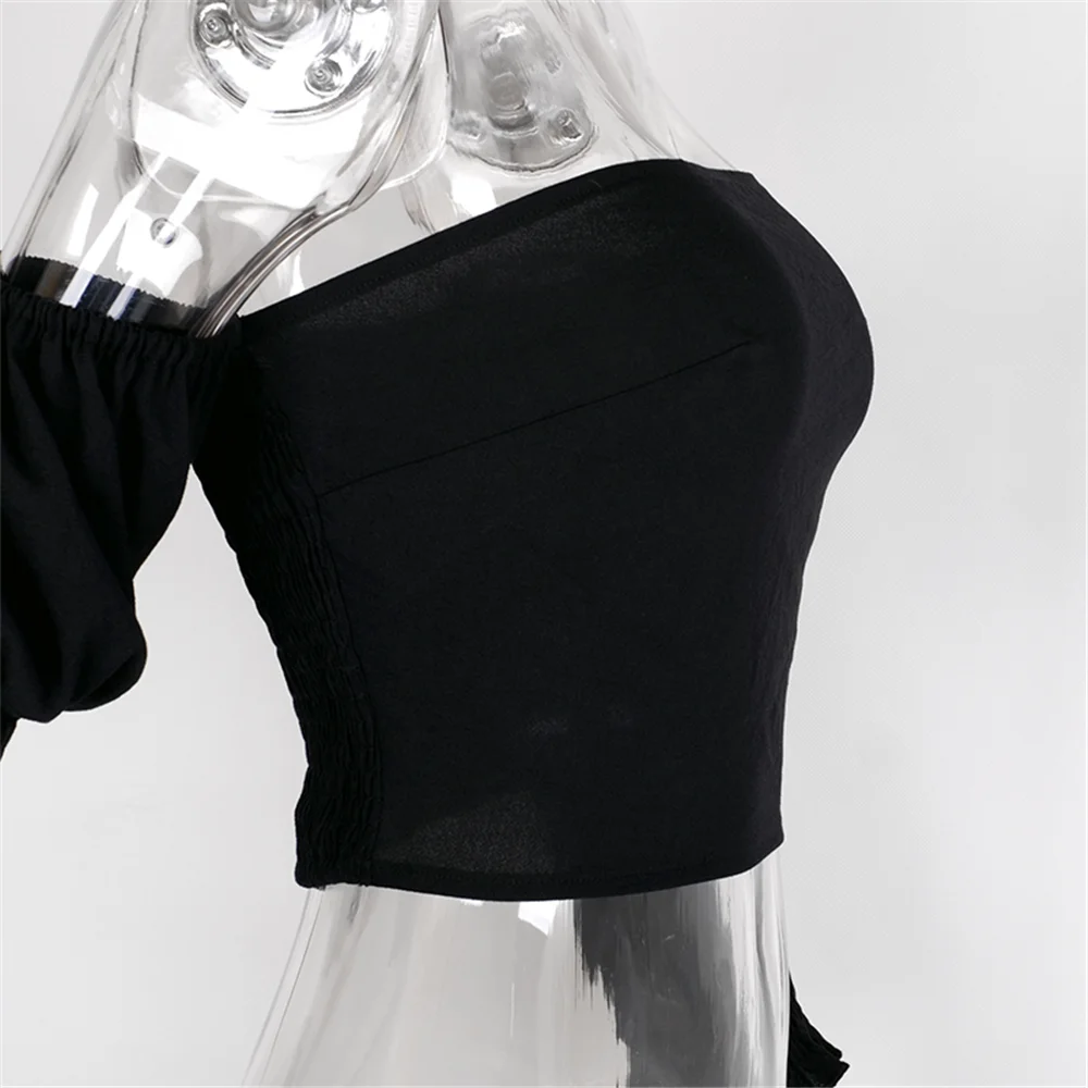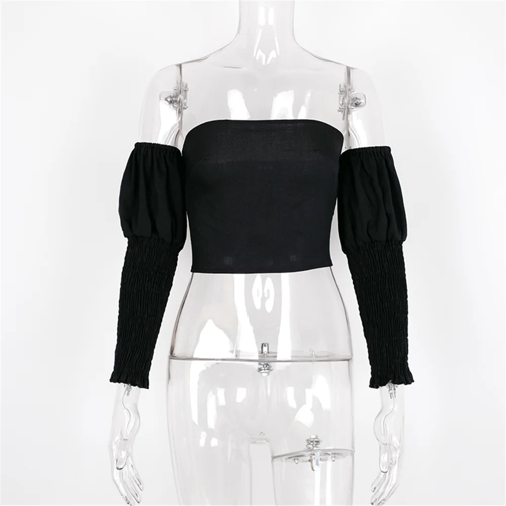 | Three Ratels Shoulder-Off Chest Wrap Solid Blouses Tops Slash Neck Long Sleeve Crop Top Womens Personality PartyClub Crop Shirt |