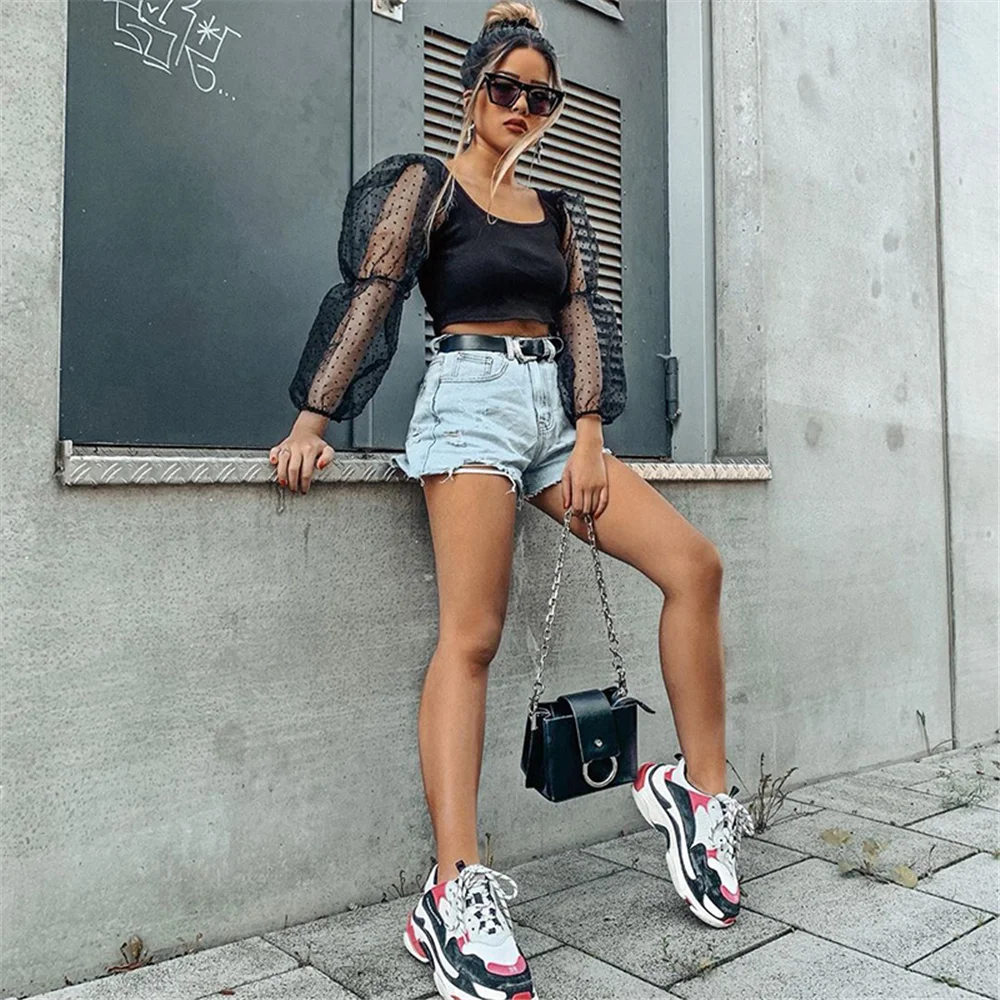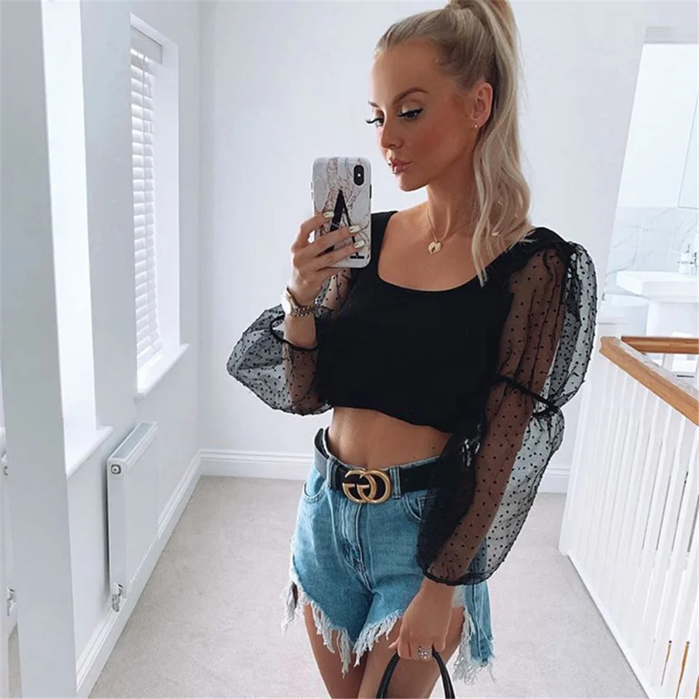 | Three Ratels New Fashion Solid Blouse See-Through Mesh Long Puff Sleeve Tank Splice Cropped Shirt Women Trendy Casual Crop Tops |